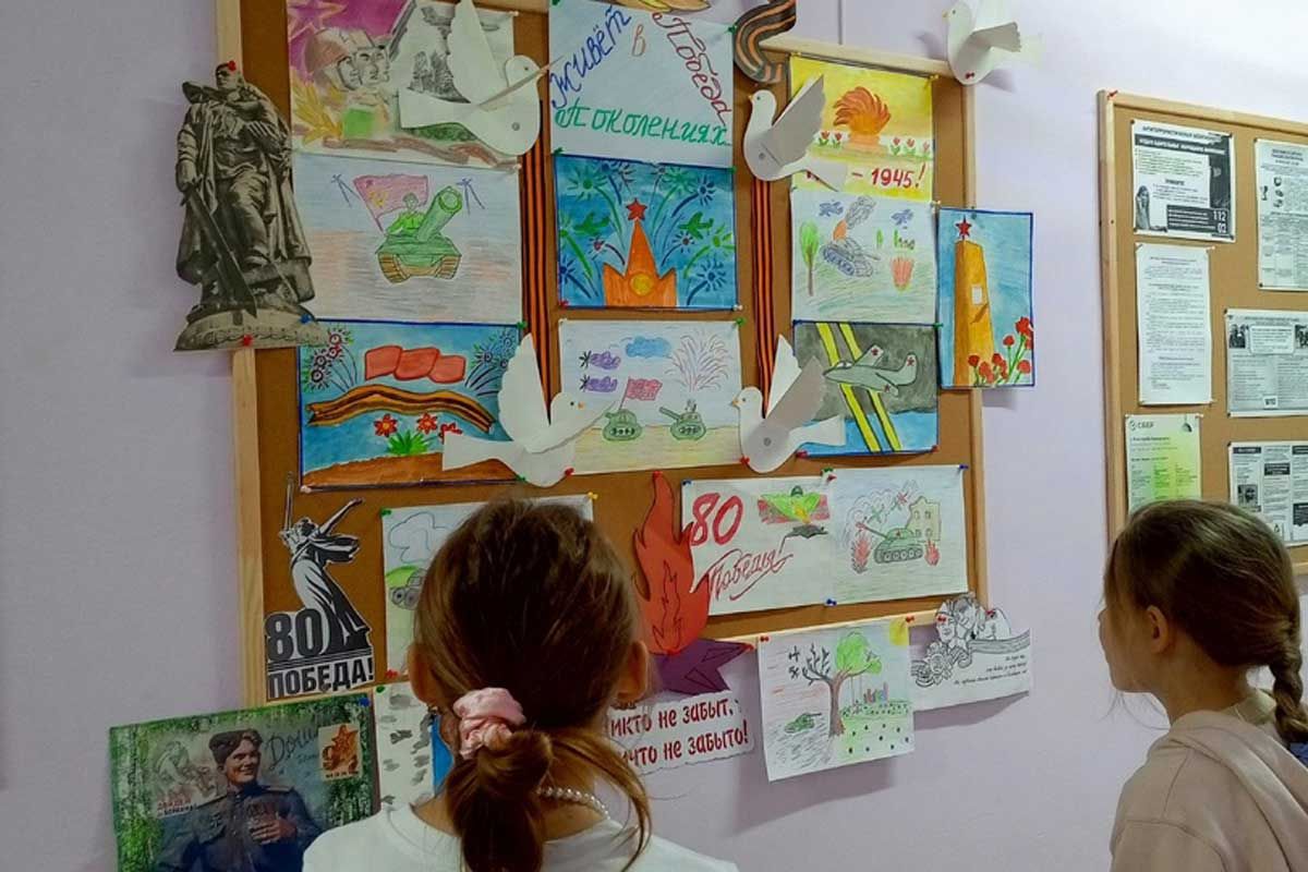 В пластовском сельском клубе оформлена выставка детских рисунков «Живёт Победа в поколениях». Она посвящена 80-летию со Дня Победы в Великой Отечественной войне.