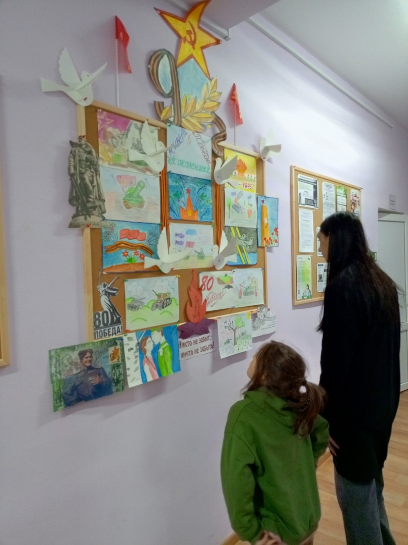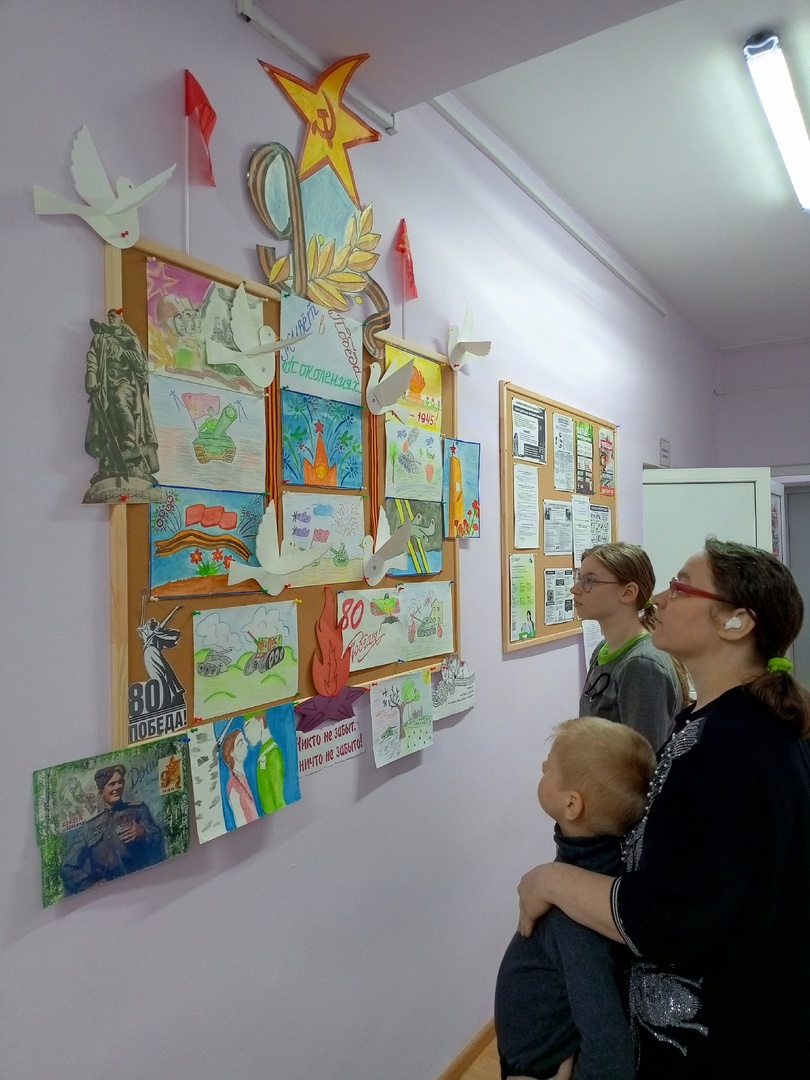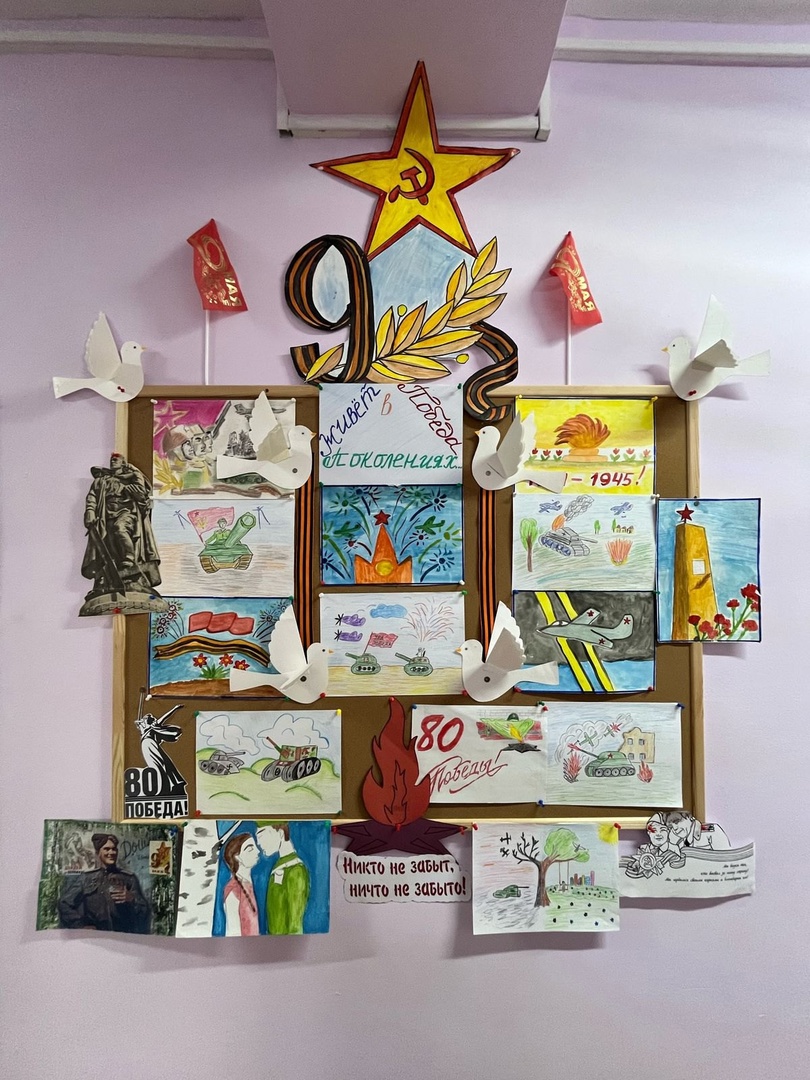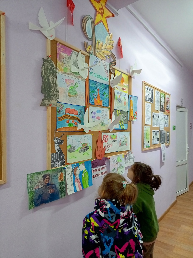 В пластовском сельском клубе оформлена выставка детских рисунков «Живёт Победа в поколениях». Она посвящена 80-летию со Дня Победы в Великой Отечественной войне.
